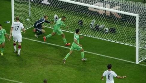 他们的坚持终于得到回报。当时钟指在第120分钟51秒时,已拼到近乎抽筋的阿尔及利亚中场贾布在德国禁区一片混战之中舍身抢点,用最后一丝力气将皮球送入网窝!阿尔及利亚扳回一城!此时比分仍然落后的阿尔及利亚没有时间庆祝,他们赶紧将球摆到中圈,希望利用最后几秒时间创造奇迹。然而上天没有眷顾他们第二次,最终,阿尔及利亚残忍地以1-2的比分遗憾出局。