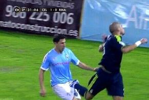 2012/2013赛季西班牙国王杯皇马队塞尔塔队的比赛中,裁判吹罚C罗越位,佩佩在追球的过程中猛的向后一蹬腿,正好踹中了对方球员拉戈的裆部,但是他的这次行为却逃脱了裁判的法眼。
