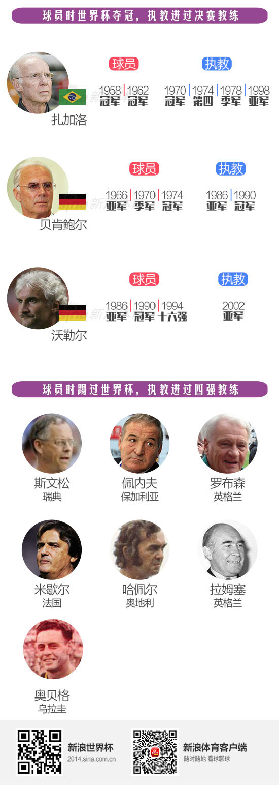 回顾世界杯历史,球员兼教练的那些人中最成功的无疑是巴西人扎加洛,作为球员他获得了1958年和1962年两届世界杯的冠军奖杯,而作为教练他四次率领巴西队闯进世界杯的四强,并在1970年获得了世界杯的冠军。