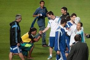 当然,在这群冲进阿根廷训练场的疯狂球迷中,我们还发现了一位长相酷似小罗的球迷,他也直接朝着梅西单膝跪地,在与梅西进行了一次亲密的互动之后,这位“假小罗”也是逗乐了阿根廷的所有球员,最终,“小罗”还是没能够逃过现场的安保人员的控制,被强制带离了现场。