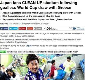 英国《每日邮报》特别聚焦,称日本球迷成为了世界杯上一道独特风景。该报称,在主裁判吹响终场哨之前,日本人清理垃圾的行动就开始了,而当他们走后,身后留下的体育场,和他们刚来时一样干净。《每日邮报》还指出,日本球迷每个人随身携带一个蓝色的塑料袋,在比赛中,他们曾集体挥舞,作为助威道具,而比赛后,蓝色袋子就成了垃圾袋,用来清理看台垃圾。美国媒体也对日本人清理垃圾的行为予以聚焦,美联社称赞道,这种传统的集体行为是植根于日本人价值观中的,源于他们对东道主以及环境保护的尊重。