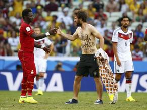 今晨,德国队和加纳队激战正酣,一名上身赤裸的球迷闯入球场成功地吸引了全世界的目光。不过身为德国队球迷的他竟然选择了和加纳队的蒙塔里握手,他身上写着自己的电子邮箱,这下全世界都能联系到他了。