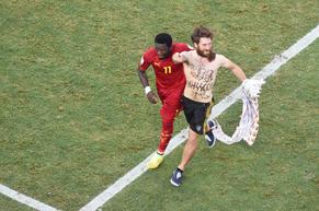 在瑞士队2比5不敌法国队的比赛中,一名球迷半裸冲入球场,工作人员很快请他出场 供图/IC