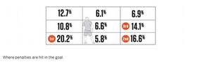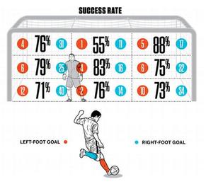 如果把球门平均分成9个部分的话,主罚者眼中的球门右上角是点球成功率最高的区域,世界杯历史的点球大战中,射向这个角度的点球有88%都命中。而命中率最低的区域,则是球门正上方,仅为55%,比球门其他区域都低得吓人。