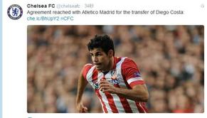 切尔西俱乐部官方宣布,签下西甲锋霸迭戈-科斯塔